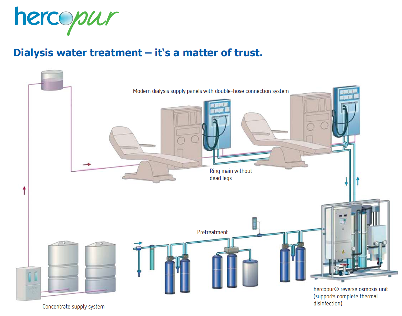 With the hercopur double-hose connection system, you can prevent the health of your dialysis patients suffering as a result of endotoxins.Even when the dialysis unit is not in operation or is disconnected, the inlet hose remains attached to the water system and subject to continuous circulation.